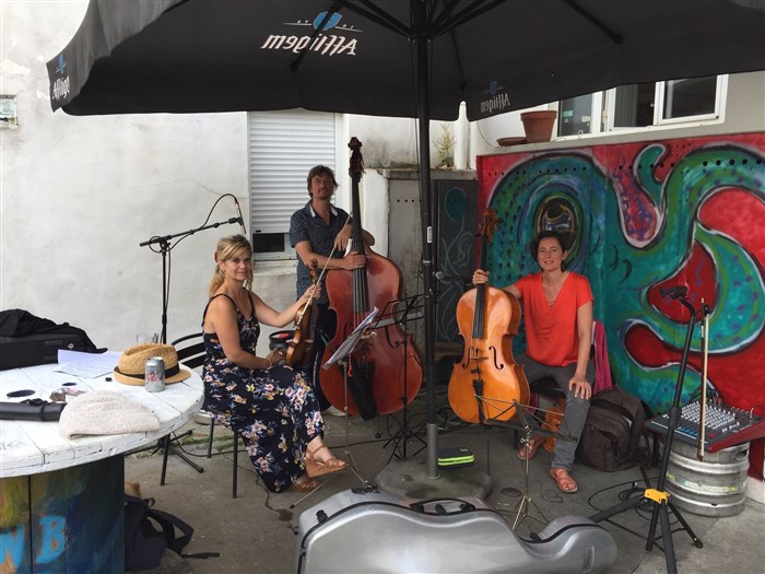 Florence Cormier, violoncelliste, s'entoure de ses compagnons musiciens de longue date Ludivine Houssaye au violon et Sylvain Plommet à la contrebasse.