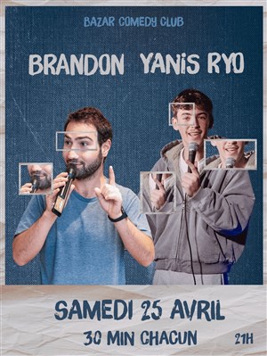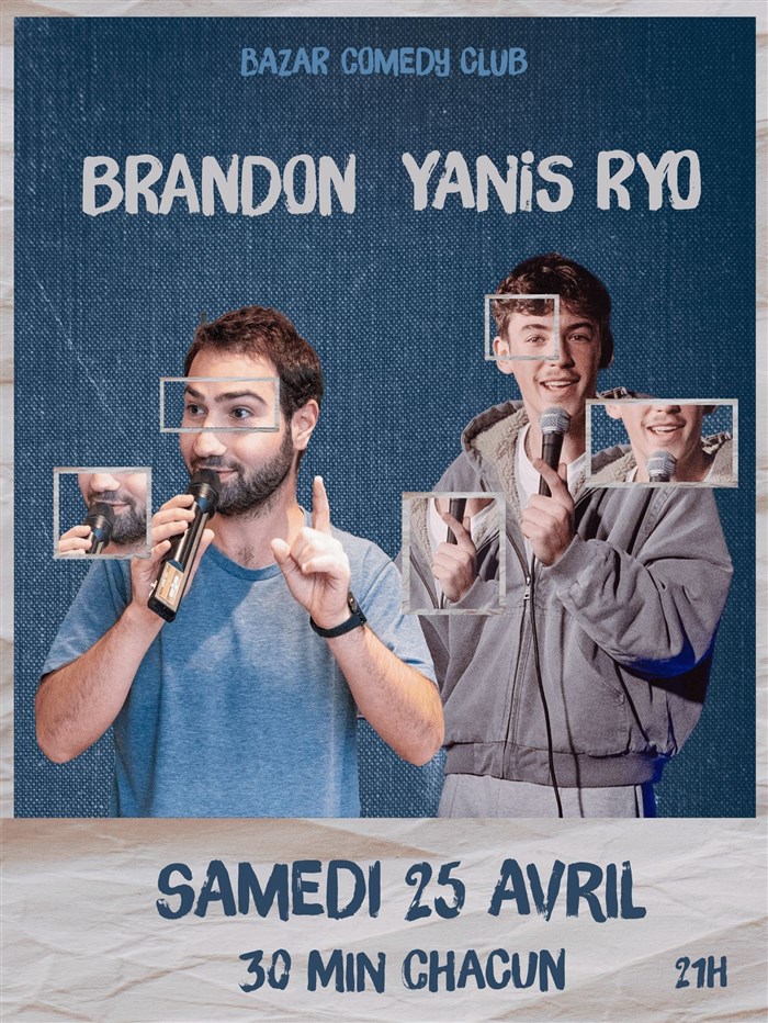Découvre 1h de blagues avec Brandon Nacass & Yanis Ryo, qui fait partie de notre sélection d’événements de type Duo ou trio d’humoristes et qui se tient ici : Le Bazar -