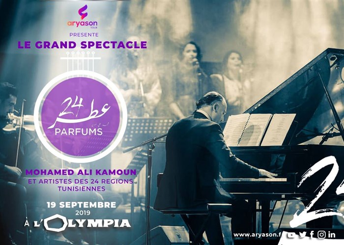 Mêlant musique tunisienne, jazz, musique symphonique et arts visuels 24 Parfums une création orchestrale du pianiste et compositeur tunisien Mohamed Ali Kammoun, accompagné d'artistes des 24 régions de son pays.