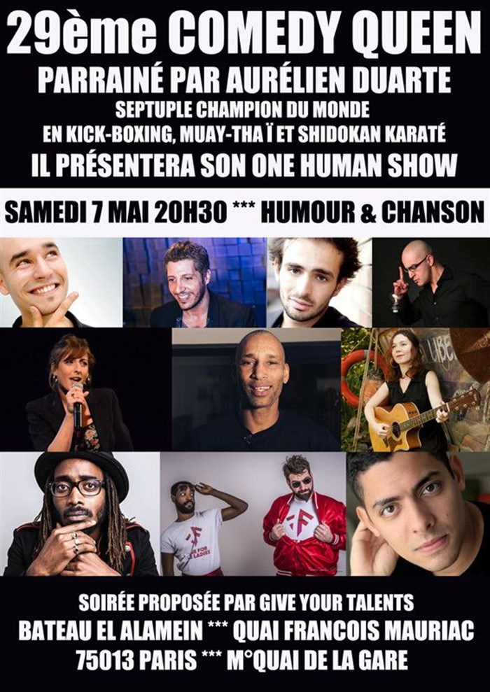 Pour sa 29ème Edition, le Plateau d'Artistes Comedy Queen se réjouit d'accueillir comme Parrain de la soirée, Aurélien Duarte, septuple champion du Monde de Kick-Boxing, Muay-Thaï et Shidokan Karaté. L'occasion pour lui de vous présenter pour la première fois un extrait de son One Human Show.