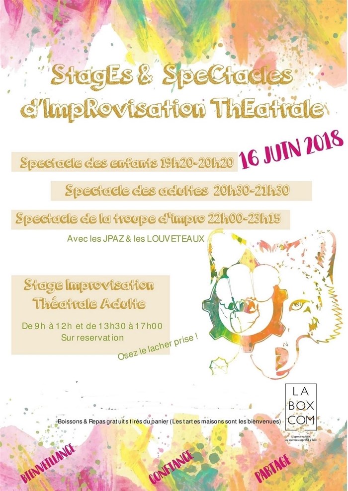 Trois spectacles sont prévus le samedi 16 juin 2018, à partir de 19h20 jusqu'à 20h20 pour le spectacle des enfants, à 20h30 spectacle du cours des adultes de 1h et pour finir à partir de 22h00 spectacle de la troupe d'impro.