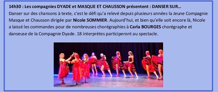 Danser sur des chansons à texte, c'est le défi qu'a relevé depuis plusieurs années la Jeune Compagnie Masque et Chausson dirigée par Nicole Sommier. Aujourd'hui, et bien qu'elle soit encore là, Nicole a laissé les commandes pour de nombreuses chorégraphies à Carla Bourges chorégraphe et danseuse de la Compagnie Dyade.
