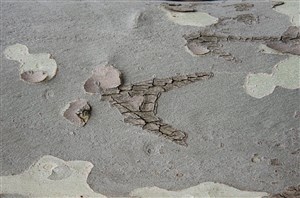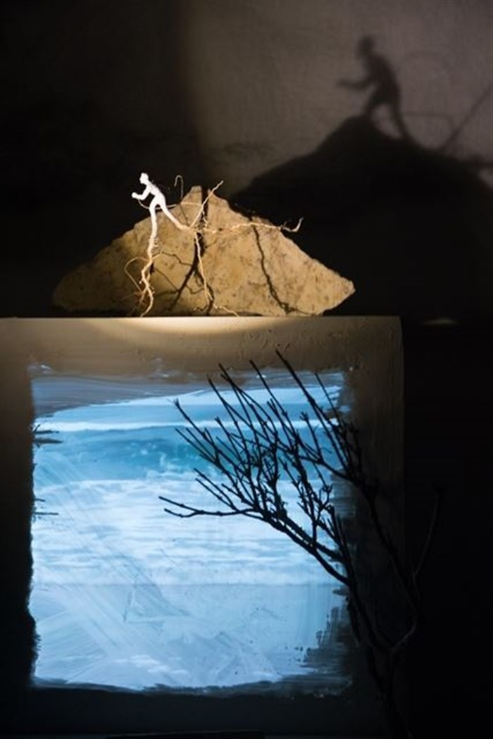 L'espace, plongé dans la pénombre, est constellé de sellettes d'exposition. Sur certaines, d'anciennes cartes géographiques représentent l'emplacement du paradis terrestre ; sur d'autres, des sculptures de petits hommes aux pieds de racines, une maison de papier, des verres emplis d'une eau mystérieuse. Les visiteurs, enveloppés par une douce ambiance musicale, déambulent à leur rythme. Le temps s'étire. Quand soudain !...