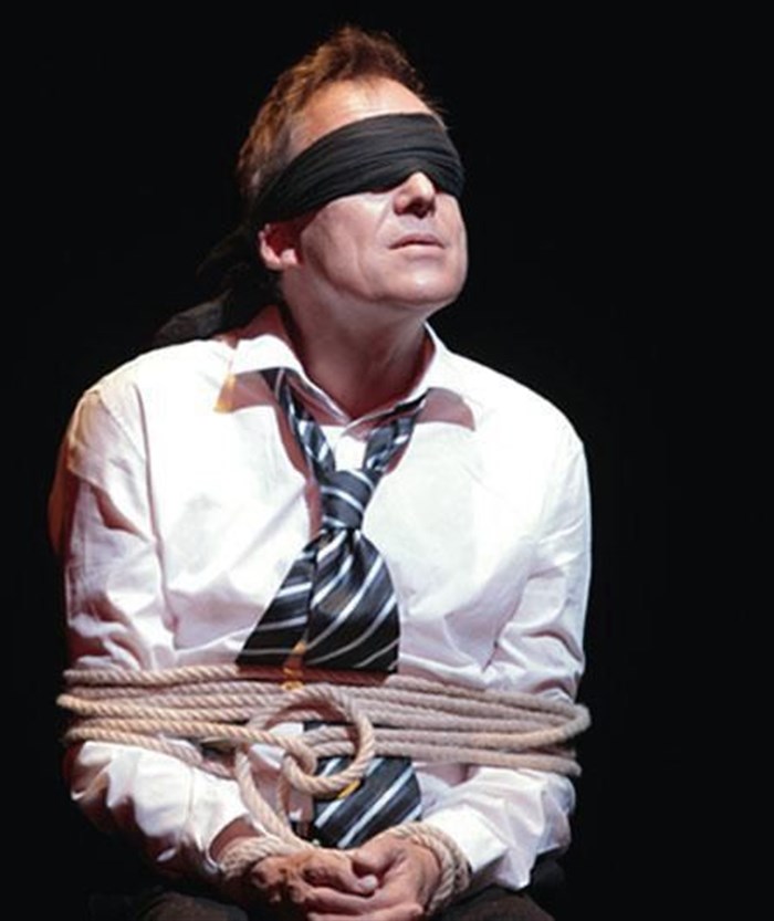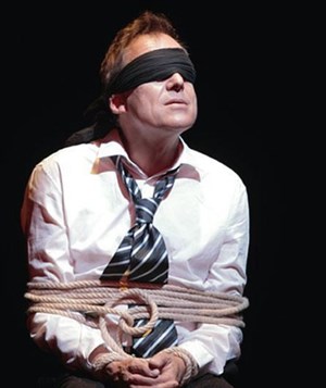 Assis sur un tabouret, un homme d'affaire surdoué et surbooké, pieds et mains liés, les yeux bandés....