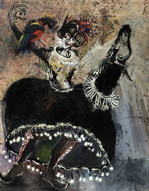 Avec des vides et des pleins marqués, les costumes denses et opaques, chargés de peinture, semblent encore matérialiser la pesanteur alors que les membres et les visages se posent dans un paysage cosmique.