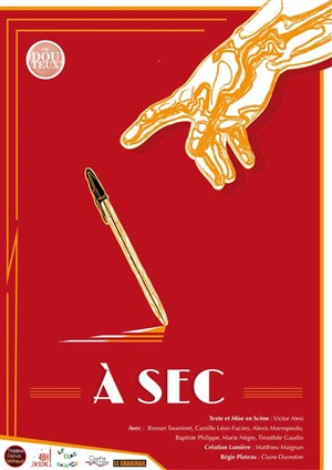 Deuxième création de la Compagnie Douteux, écrite et mise en scène par Victor Alesi, "À Sec " est une pièce haute en couleurs ! Tragique, clownesque, drôle et sensible, le spectacle transforme une petite histoire de stylos en un vrai récit d'initiation. Grâce à un texte ingénieux et trépidant porté par des comédiens et comédiennes à l'énergie débordante, le spectacle nous parle avec légèreté de problématiques actuelles : comment faire partie d'un groupe tout en existant individuellement ? S'épanouir au travail ? Agir ensemble ?