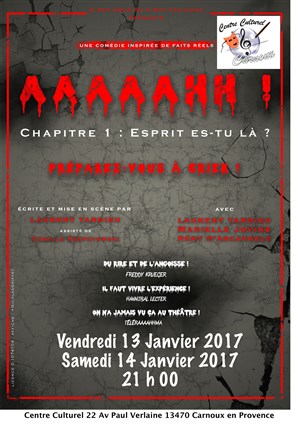 Spectacle à voir pour passer un bon moment entre rires et peur ! Les acteurs, la mise en scène, le décor... Tout est extrêmement travaillé. Soyez attentifs tout au long de la pièce !!! BRAVO à cette jolie troupe de théâtre de nous faire sortir des sentiers battus et re-battus... Une soirée surprenante au top, comme on les aime. Bref ! Courez-y.