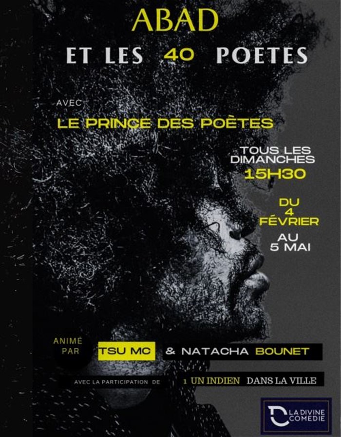 "Abad et les 40 poètes" est un spectacle hebdomadaire où la poésie et la performance se rejoignent pour créer un voyage inoubliable allant de l'humour à l'émotion pure. Des personnalités invitées du monde artistique et littéraire partagent leurs passions et leur créativité, et l'interaction avec le public est au coeur de l'expérience. Le spectacle offre une atmosphère chaleureuse et accueillante où le public devient une partie intégrante du show.