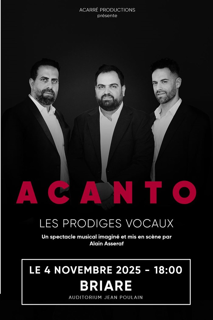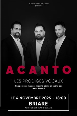 Acanto, trio de chanteurs, séduit avant tout par la qualité de sa performance vocale. Les interprètes chantent avec un plaisir manifeste, communicatif, qui crée une belle proximité avec le public. La mise en scène, simple et sans réelle recherche créative, se contente d’accompagner les voix, laissant toute la place au chant. Le répertoire, très accessible, mêle avec habileté grands airs classiques et « tubes » de la variété, dans un esprit résolument actuel. Une soirée musicale agréable, portée par le talent et l’enthousiasme des chanteurs.