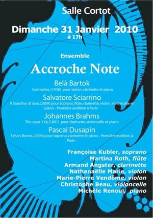 L'ensemble Accroche Note, avec des oeuvres de Bartok, Brahms et deux premières auditions parisiennes de Sciarrino, et Dusapin...