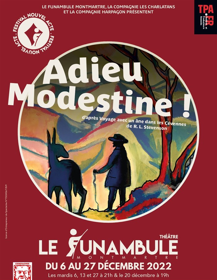 Adieu, Modestine ! est une création issue du roman de Stevenson Voyage avec un âne dans les Cévennes. Cette comédie présente au public la galerie de personnages pittoresques rencontrés par Stevenson tout au long de son voyage.