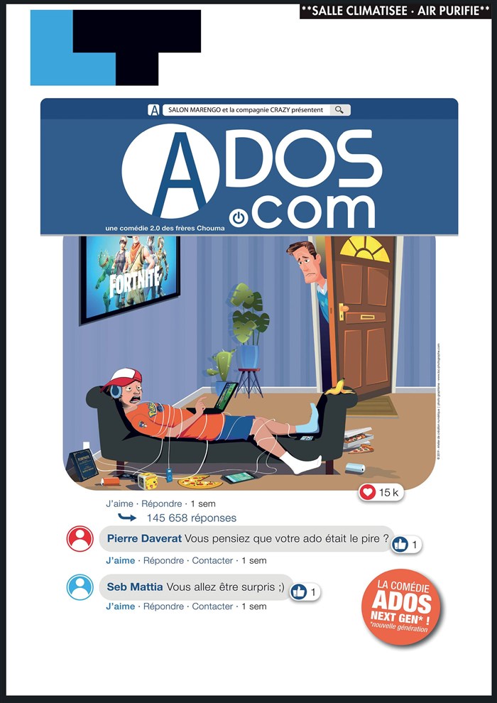 Pas facile d'amener nos ados au théâtre, mais cette pièce a été un succès auprès des nôtres ! Exactement ancrée dans les codes actuels des ados, beaucoup d'humour pour ados, mais aussi beaucoup d'humour pour les parents ! Un vrai bon moment, aucune crainte à avoir sur les sujets abordés, on a le smile tout le long de la pièce ! Merci