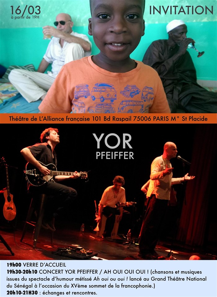 Yor Pfeiffer et ses musiciens animeront la soirée avec un mini concert (19h30-20h10) présentant les chansons et musiques extraites du spectacle d'humour métissé Ah oui oui oui ! lancé à l'occasion du XVème sommet de la francophonie au Grand Théâtre National du Sénégal.