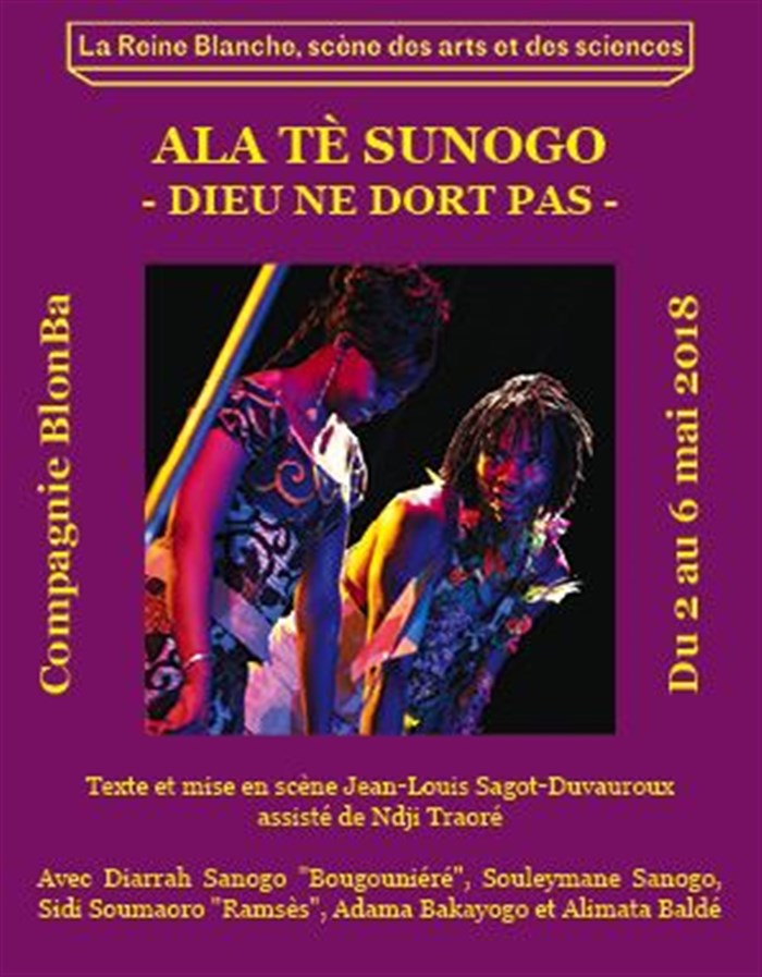 Dieu ne dort pas/Ala tè sunogo en lange bambara, est un spectacle qui allie la farce et le rêve, l'humour et la réflexion, la poésie et l'engagement.