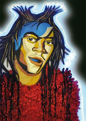 Sa galerie de portraits offre une première salve de réponses. Et une figure emblématique : Basquiat. Pour lui, elle pousse la technique du collage dans sa 3e dimension. Elle agglomère tubes de peinture, jouets, figurines sur son torse de bois, comme s'il portait sa vie en bandoulière. Comme si tous ces objets recelaient la charge émotive enfouie, le secret "naïf" d'un parcours hors du commun. Peints rouge sang, ils témoignent de la rudesse du combat artistique, finalement auréolé d'un néon bleu de reconnaissance.