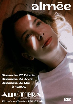 Sur scène au clavier accompagnée par Mélanie Centenero aux percussions, Almée poursuit son exploration de l'intime et nous partage ses titres accompagnés d'intermèdes parlés qu'elle habille de synthés. Après s'être produite dans de très beaux lieux parisiens (Les Trois Baudets, Le Zèbre de Belleville, Barbara FGO, ainsi qu'à L'Eglise Saint-Eustache dans le cadre du festival les 36 heures de Saint Eustache) Almée est de retour à L'Alhambra pour deux dates exceptionnelles.