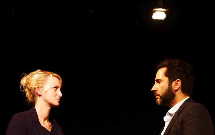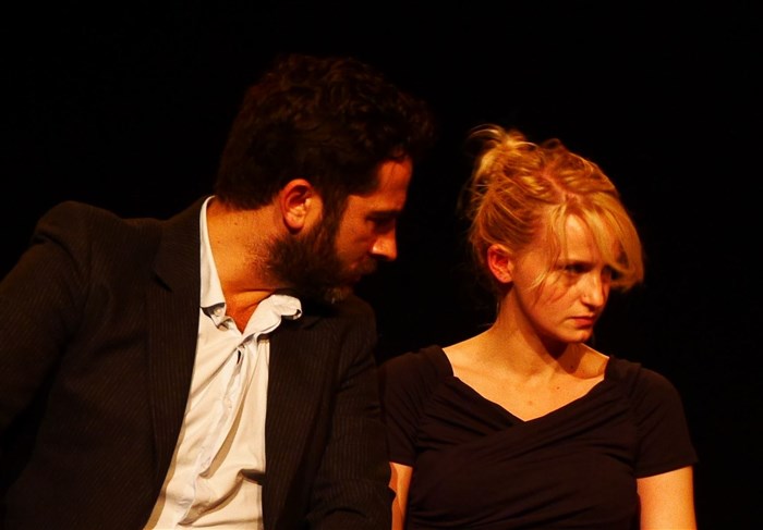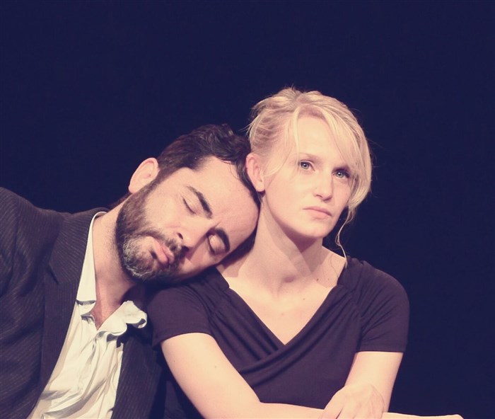 Un homme et une femme face à face. Une histoire d'amour en quatre tableaux. " Ames Soeurs ", du dramaturge contemporain Enzo Cormann.