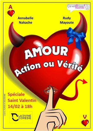Découvre Amour, Action ou Vérité ?, qui fait partie de notre sélection d’événements de type Théâtre et qui se tient ici : La Divine Comédie -