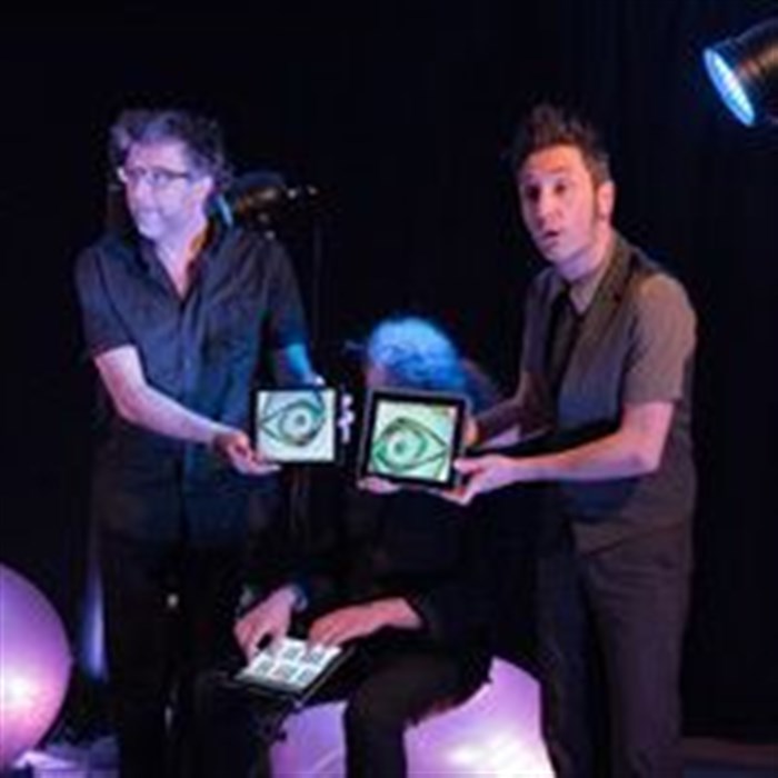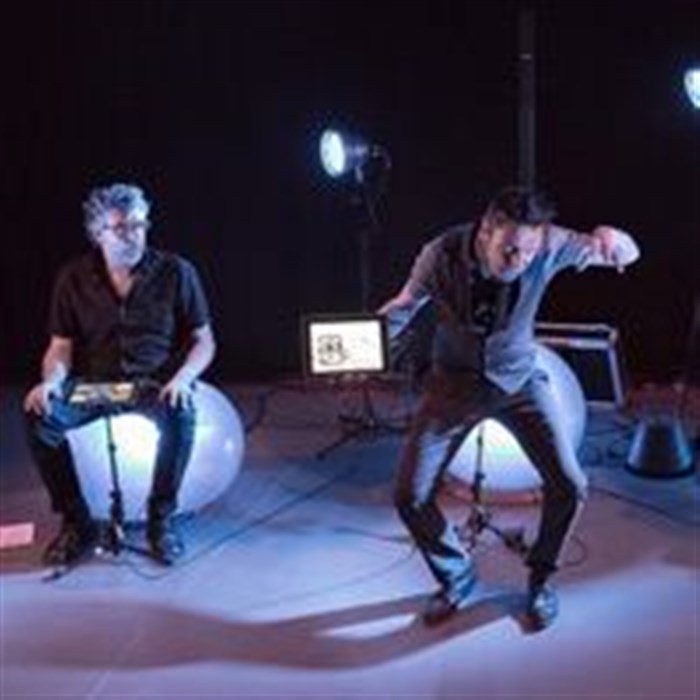 Assis sur trois gros ballons aux couleurs changeantes, c'est déjà un vrai spectacle de les voir glisser, taper ou pianoter des dix doigts sur ces petits écrans et jouer comme des enfants à dessiner l'univers musical de celui qui " aime avoir l'air d'un Riquet à la houppe ".
