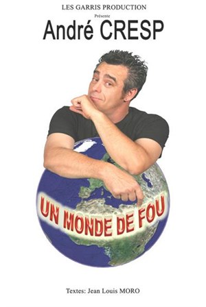 "Un monde de fou" écrit par Jean-Louis Moro. Dans ce one-man-show délirant André Cresp nous entraîne dans son monde de fou à travers des personnages décalés, pittoresques, illuminés et d'une drôlerie irrésistible avec lesquels il nous fait toucher du doigt la connerie récurrente de la société dans laquelle nous vivons. Tout y passe : La foi, les institutions, la folie ordinaire, la vieillesse, la chirurgie esthétique.