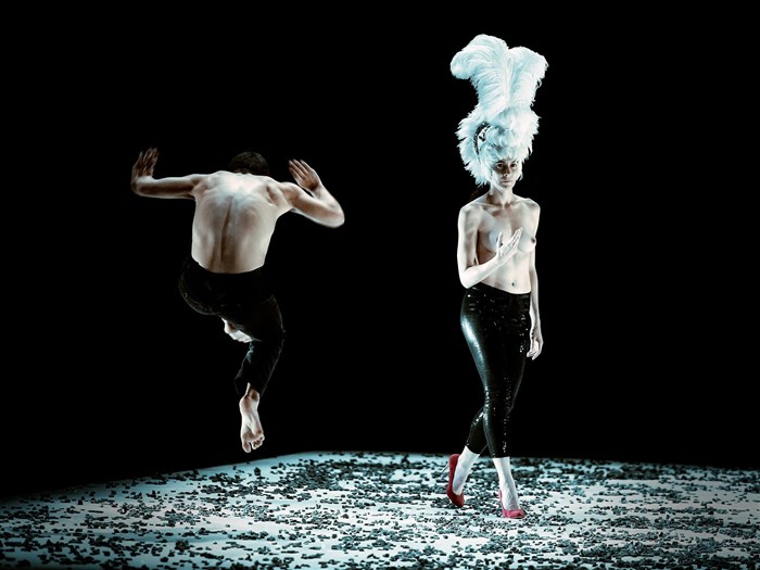 Dans une lumière en clair obscur, des corps costumés ou nus créent des tableaux en action, explorant par un flux d'images l'idée de combat, d'amour, de désirs.