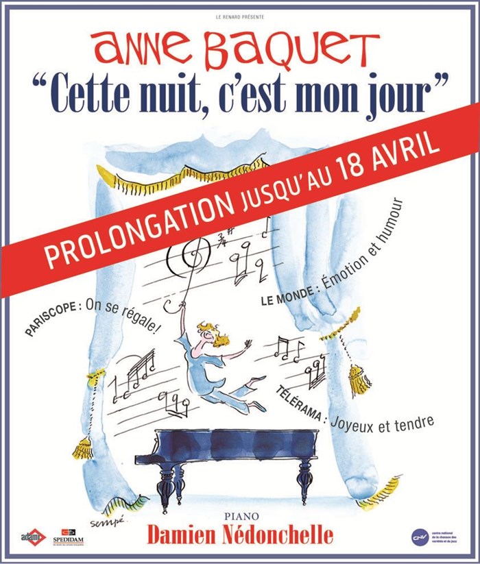 Il était une fois...Anne Baquet ! Fan de cette chanteuse depuis longtemps je ne rate aucun de ses spectacles. De passage à Paris il y a une semaine, je suis donc allez voir voir " Cette nuit c'est mon jour " J'ai passé une soirée formidable ! Ce spectacle est complètement différent puisqu'il ne s'agit pas de chansons qui se succèdent mais d'une histoire, celle d'une petite fille. Les chansons se mélangent aux textes , jolis moments de comédie. Anne interprète tous les personnages avec le talent qu'on lui connaît et le spectacle ne connaît aucun temps mort. Elle virevolte, se transforme en un éclair en adolescente boutonneuse, chanteuse russe extravagante (et émouvante) en passant par le chanteur pour ados. Chant, comédie, danse, Anne Baquet possède ces trois disciplines auxquelles elle rend un bel hommage (mais je vous laisse découvrir ses professeurs...) Bien sûr il ne faut pas oublier son talentueux pianiste Damien et son couvre-chef inhabituel quand il se met à l'accordéon (je n'en dirais pas plus) Et c'est sur un final , hommage hilarant à Michel Legrand que les 2 complices nous laissent (on en redemanderait !) Bref, il faut y aller et y retourner ! Annie Cordie, grande dame du music hall, dit d'elle même : Je ne suis pas une star, je suis une artiste. Anne Baquet est une artiste, et de la plus belle eau.