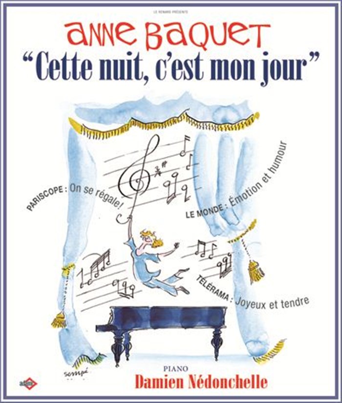 Nous avons été transportés de bonheur et d'admiration devant tant de talent : Anne Baquet qui sait tout faire , à la perfection , c'est une artiste COMPLETE....ce qui est rare...Son pianiste talentueux etUI n'hésite pas à " jouer " avec elle ...BRAVO BRAVO ...Merci...d'ailleurs nous reviendrons ...avec des amis et nous allons " battre tambour " autour de nous ! ! !