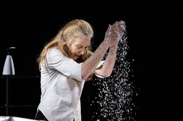 Accompagnée d'un quatuor à cordes sur écran et filmée en direct par plusieurs caméras, l'actrice Ghita Serraj livre une performance grandiose.