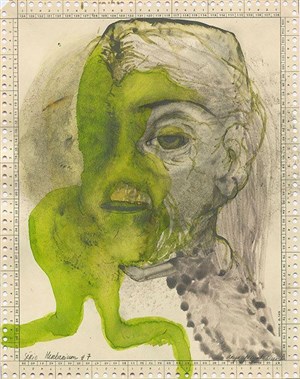 Nous connaissons de l'artiste d'origine russe, ces étranges dessins au crayon liquide sur carte perforée, qui déploient sur un format confidentiel les images mentales d'un univers bien particulier, fait de créatures fantastiques et ondoyantes. Ce support, un vestige des débuts de l'ère informatique, servait à enregistrer des données, et dans ce cas bien précis les notes des élèves. La rigueur du cadre qui forme comme une dentelle de chiffres, contraste avec les visions fantasmagoriques qui s'y inscrivent.