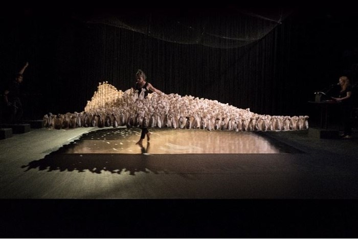 Une danseuse, deux marionnettistes et une musicienne... et une foule de marionnettes à longs fils, stockées dans leur sac, comme une communauté compacte, immobile. Progressivement place au mouvement. Les sacs semblent interdépendants, accrochés au même support. Et pourtant dans le balancement que provoque le passage de ces géants humains, certaines figures impriment des trajectoires singulières...