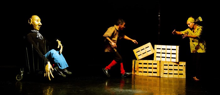 Sur le plateau circulaire, les personnages sont interprétés par des comédiens français et maliens,accompagnés de marionnettes de taille humaine.