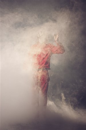 Sur le plateau, le danseur, habillé de rouge écarlate, dialogue imaginairement avec son père et convoque fantômes, rites funéraires et souvenirs dans un paysage de brume, mystérieux et sublime.