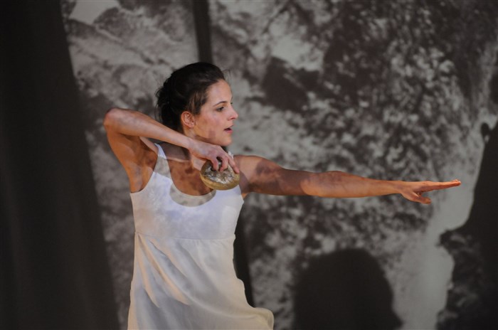 Au bord de l'eau, une forme dansée dans un espace vide, sur fond d'images projetées et de musique.