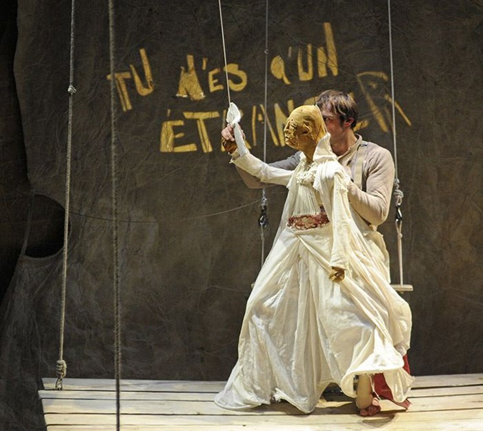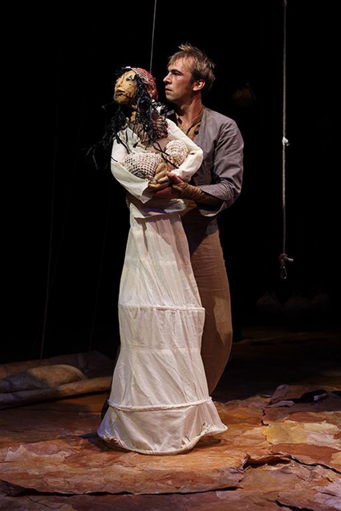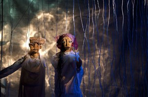 Les marionnettistes Camille Trouvé et Brice Berthoud ont pris le parti d'une approche originale mêlant étroitement récit et musique en direct, manipulation à vue et proximité avec le public installé à même le plateau sur un gradin circulaire permettant d'embarquer pleinement dans l'histoire ; car c'est sur un radeau que se déroule l'action, un radeau environné de cordages au-dessus duquel pendent les chrysalides de toile d'où sortiront les impressionnantes marionnettes de papier, un matériau qui est la marque de fabrique de la compagnie.