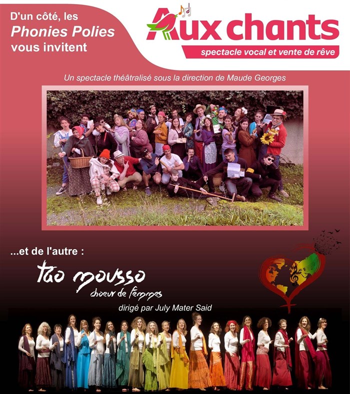 Les Phonies Polies, choeur lyonnais plein d'entrain, et Tao Mousso, dynamique choeur de femmes d'Evian-les-Bains, présentent un concert commun : " Aux chants, spectacle vocal et vente de rêves ! ".