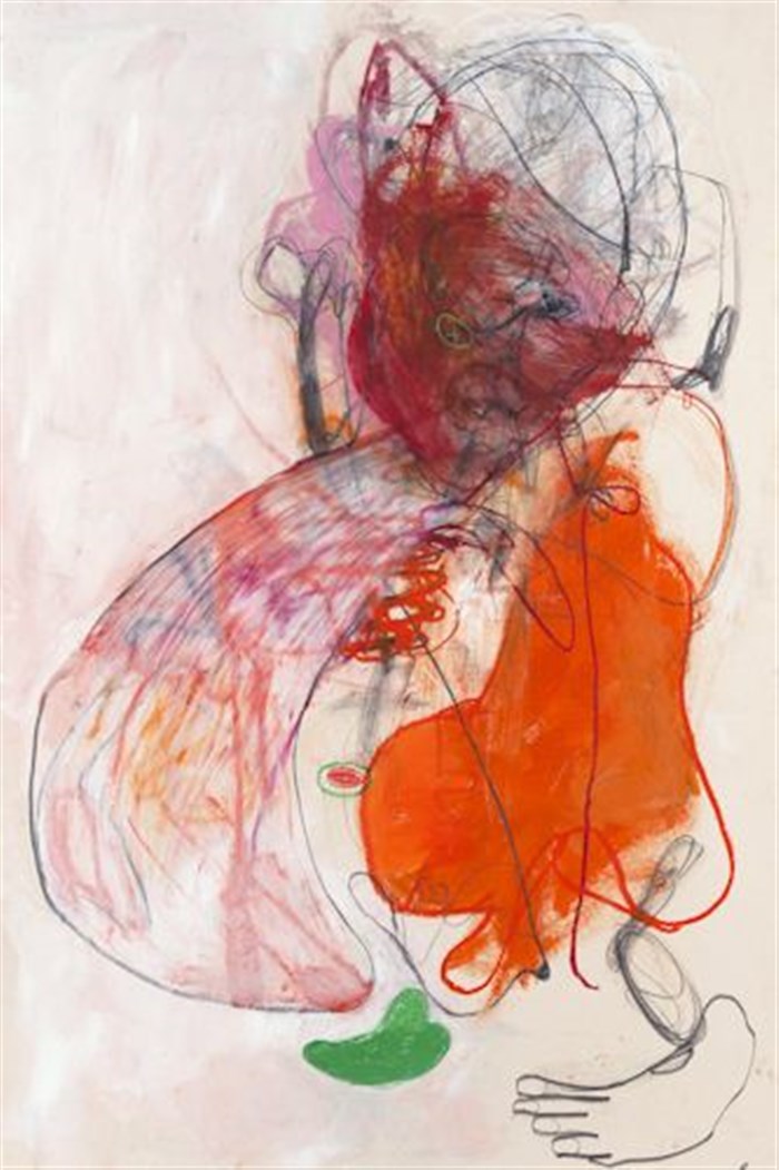 Les mouvements circulaires du crayon, bousculés par les traits à la fois énergiques et fragiles du pastel, font surgir des personnages aux multiples facettes où s'entrechoquent des émotions violentes et contradictoires. Le dédoublement, la superposition, la rature et les aplats forment les éléments de sa syntaxe. Dans ces dessins foisonnants et colorés, les signes et les mots font partie intégrante de la composition et viennent crier avec force les pulsions de la colère, de l'angoisse et du désir.