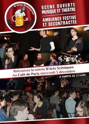 Comme dans les épisodes précédents, de la musique, du théâtre et plein d'autres choses vous attendent. Et parce que B'arts Scéniques aiment quand un plan se déroule sans accroc, ça se passera non pas au 21 Jump Street mais au Café de Paris (158 rue d'Oberkampf), pour un début à 20h30 pétantes.