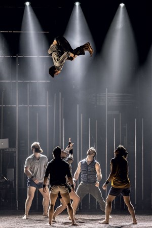 Sur scène, deux musiciens et dix acrobates mêlent prouesses techniques, prise de risque et émotion.