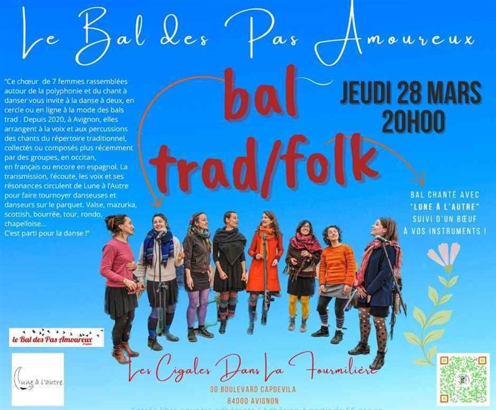 Le Bal des Pas Amoureux présente le bal TRAD/FOLK avec playlist et groupe " Lune à l'autre " groupe de chant à danser. Boeuf musicien.