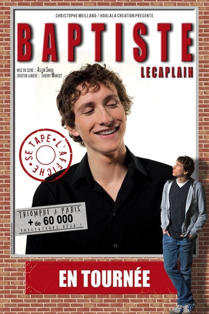 Après un an de succès au théâtre le Temple et 8 mois au théâtre Trévise à Paris, après le carton de son spectacle au Palace pour le Festival Off d'Avignon 2011, après avoir conquis le Bataclan pour 9 représentations à guichets fermés en 2012, Baptiste Lecaplain débarque pour une tournée dans toute la France avec son spectacle " Baptiste se tape l'affiche ".
