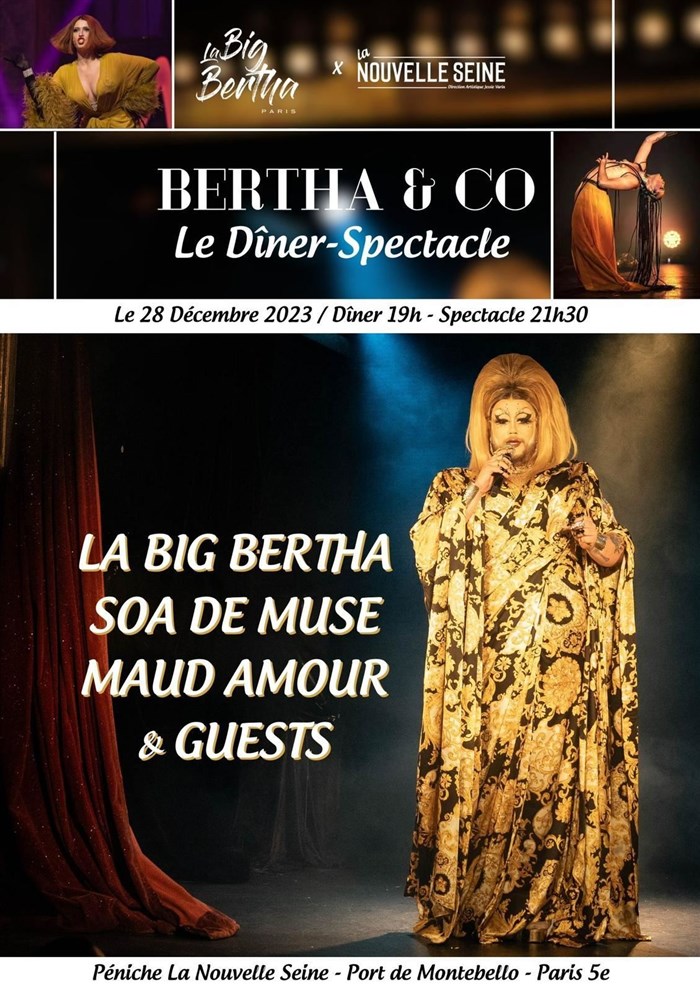 À 19h on savoure le Menu de "La Table de Bertha" (en résidence culinaire à la Nouvelle Seine jusqu'au 31 Décembre 2023) en profitant du cadre unique et romantique de La Nouvelle Seine et à 21h30 on se retrouve dans la salle de spectacle pour un show Drag avec des Guests Maud Amour et Soa de Muse !