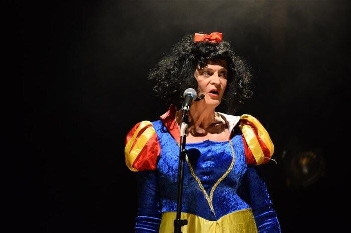 Du haut de ses 191 cm, elle subvertit les histoires par ses calembours perfides pour s'attaquer, en Blanche-Neige personnifiée, au sexisme dans les contes de fées.