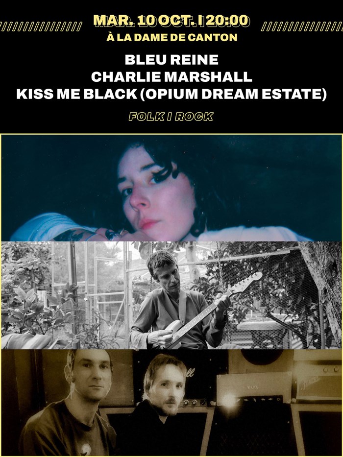 L’événement Bleu Reine + Charlie Marshall + Kiss Me Black de type Pop / Rock / Folk, organisé ici :