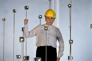 Une femme découvre sous un casque de chantier un petit cube transparent, comme une boite à meuh qui ferait "bip" "bip".