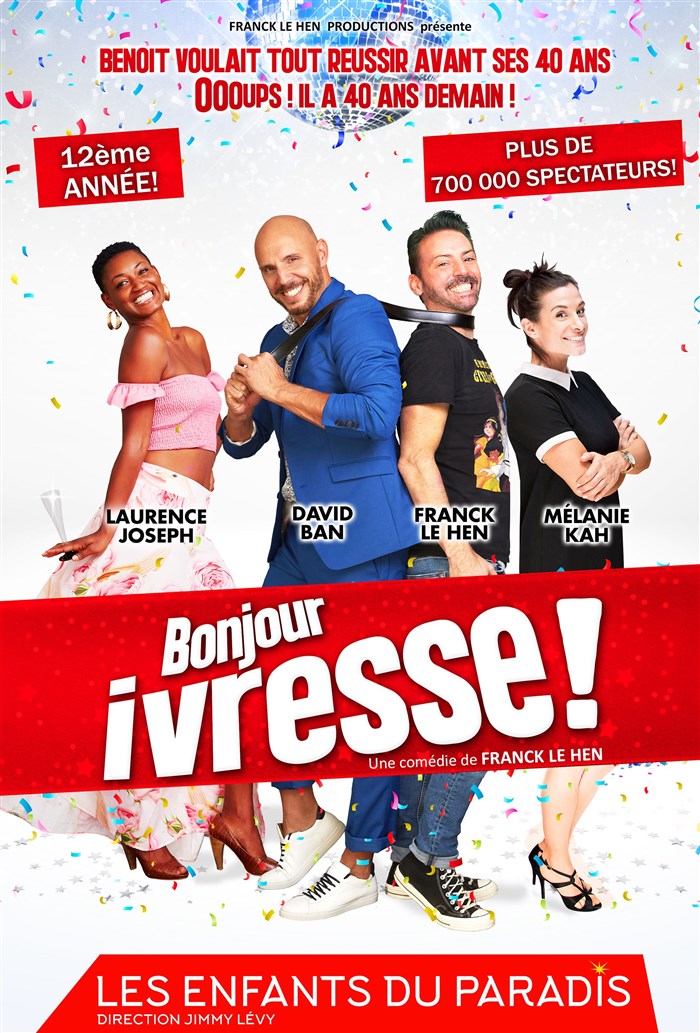 Bonjour ivresse a été créé en 2010 et a tenu plus de 8 ans à l'affiche, comptabilisant déjà plus de 2050 représentations ! Cette reprise est de nouveau un succès depuis juillet 2021 !