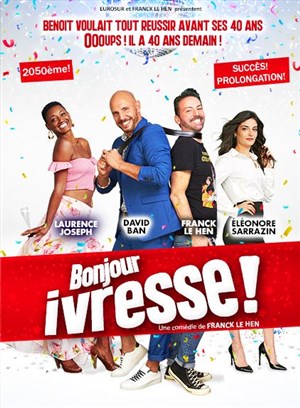 Bonjour ivresse a été créé en 2010 et a tenu plus de 8 ans à l'affiche, comptabilisant déjà plus de 2050 représentations ! Cette reprise est de nouveau un succès depuis juillet 2021 !