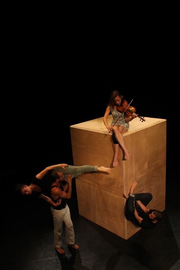 Aux sonorités d'un violon, d'une contrebasse et d'un gros cube en bois utilisé comme caisse de résonnance répondent ou se fondent les mouvements des danseurs. Réhabilitons l'échec, générateur officiel de l'imaginaire !