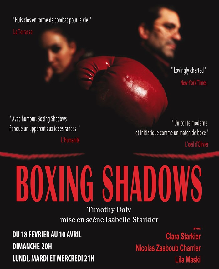 Je vous encourage à aller voir cette pièce formidable. la prestation des acteurs est remarquable, des sujets forts et actuels, une mise en scène originale et poignante. Nous vivons beaucoup de belles émotions tout au long de la représentation. Une expérience à vivre, alors n'hésitez pas à soutenir cette création unique en allant voir boxing shadows!!