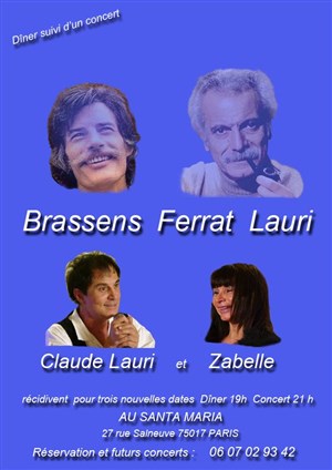 Devant le succès des trois précédentes dates au Santa Maria 27 rue Salneuve 75017 Paris et l'enthousiasme chaleureux du public, Claude Lauri et Zabelle récidivent pour trois nouvelles dates dans ce restaurant. Le dîner est à 19 h et le concert à 21 h. Etant donné la modicité du prix du dîner (12 euros), vous pouvez, si vous le désirez, participer aux frais car les artistes ne reçoivent rien du Restaurant.
