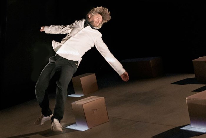 Un homme, personnage anonyme, acrobate du quotidien, lutte avec acharnement et application pour garder l'équilibre dans un environnement mouvant qui le contraint, l'oblige et le déstabilise sans répit. Enchaînant les tâches absurdes et répétitives, il tente de rester debout malgré les éléments qui le bousculent ; le sol se dérobe, autour de lui tout glisse, chute, fuit, le malmène. Il est de celles et ceux devenus pantins, piégés dans l'engrenage du travail, du rendement économique, de la surconsommation maladive, de la pression ordinaire.